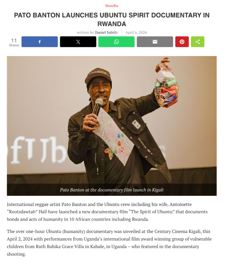 International reggae artist Pato Banton and the Ubuntu crew including his wife, Antoinette “Rootsdawtah” Hall have launched a new documentary film “The Spirit of Ubuntu” that documents bonds and acts of humanity in 10 African countries including Rwanda.